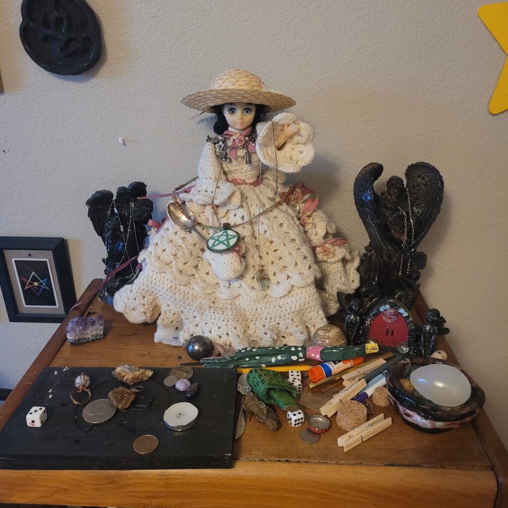 On this altar I picked a doll that suited Hecate in my eyes from the thrift store. Since I use this altar every day the items that rest upon it change. But the spell work I do for others makes keeping the same things on it hard. Most people will be setting up altars and leaving them or adding to them. Here is a list of things you can use for your Hecate altar.